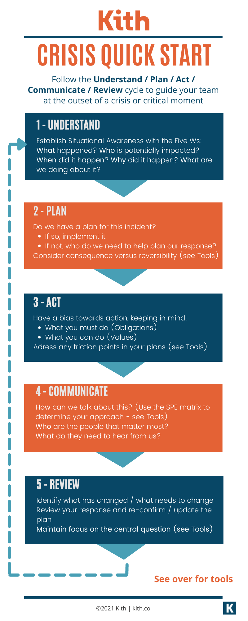 The Crisis Quick Start guide gives you the simple five-step process we use to ensure that our clients get their response off on the right foot. Follow the guide and use the tools included to give yourself - and your organization - the best chance of success.